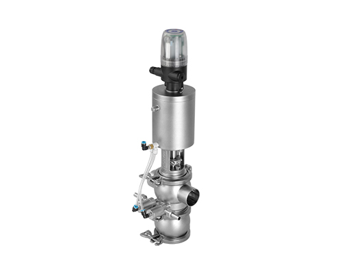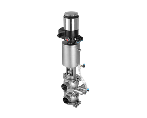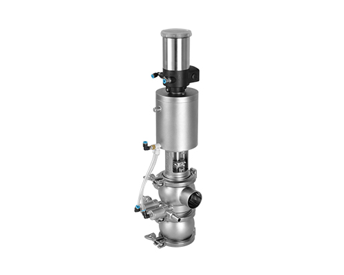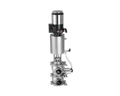 E-C系列防混閥主要由執(zhí)行機構(gòu)、連接支架、閥桿、閥體組成,閥桿通過執(zhí)行器機構(gòu)驅(qū)動做軸向直線運動,閥桿向上運動時,上下管路通道開啟;閥桿向下運動時,通道關閉。閥桿上設計有兩道密封圈與閥體密封面形成獨立的密封腔,與CIP閥相通,可用于密封檢漏;或上下管路流通不同介質(zhì)時起到防混監(jiān)測的作用。